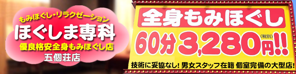 『ほぐしま専科 五個荘店』では、お客様の財布に優しい価格設定で、ご満足いただけるサービスを提供しております。「全身もみほぐし」「足裏もみほぐし」「全身・足裏ハーフ」と3種類のコースから、お客様のニーズに答える為、時間設定を細かく提供しています。 他店の場合、「全身もみほぐしコース」は、手もみ時間が長めで値段も高めなケースが多いです。しかし当店では、なんと「15分で1078円」というお手軽プランをご用意しております。気軽にボディケア・もみほぐしを受けたい方のほか、時間がないという方にも便利です。是非ご利用くださいませ♪ また、お仕事帰りの方にもご利用いただけるよう、営業時間を長めにしております。忙しいお客様のご都合に合わせてご来店頂けます。朝は9時30分から夜は深夜26時まで営業中(25時受付まで)地元で一番店になれるよう、スタッフ一同、日々施術を磨いております。